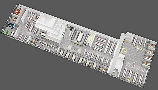 設(shè)計(jì)師從建筑空間形態(tài)出發(fā),充分挖掘和提升其價(jià)值,著重分析各個(gè)空間的體塊關(guān)系,通過大面切割的收發(fā)突破整齊劃一的空間規(guī)律,使之隔而不斷,產(chǎn)生獨(dú)特的節(jié)奏和韻律,從而打造了一個(gè)兼具科技感與時(shí)尚感的辦公空間。