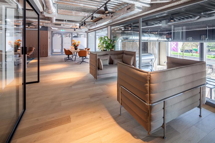 【辦公室裝修設(shè)計(jì)】交流區(qū)域:此處位于窗邊,設(shè)計(jì)師在選擇的時(shí)候特意選用開放與私人一體的沙發(fā),這樣的好處就是在不影響空間的前提下,保證交流不會(huì)被打擾,交流的雙方坐在此處可以一邊欣賞外界風(fēng)景,可以一邊進(jìn)行商務(wù)交流,這樣的交談方式讓人感到新穎與貼切,讓交流在愉悅的氛圍下展開。