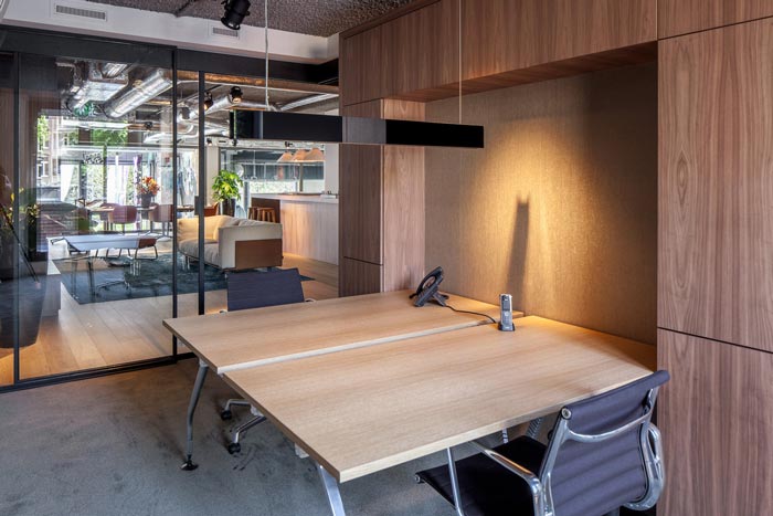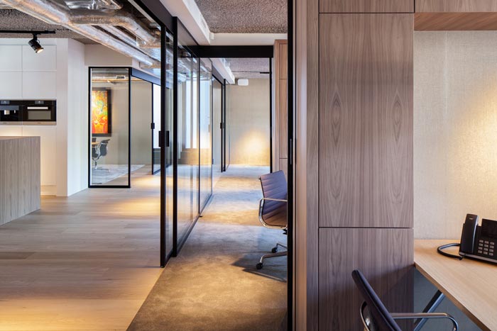 【辦公室裝修設(shè)計(jì)】動(dòng)線:通過此處可以看出設(shè)計(jì)師對(duì)于空間的掌控力,設(shè)計(jì)師在隔斷的應(yīng)用上采用推拉式,這樣設(shè)計(jì)的目的就是讓空間更加合理化,當(dāng)門拉開的時(shí)候兩個(gè)空間可以相互融合在一起,這樣做的好處就是空間無形中變大了,當(dāng)推拉門關(guān)起來之后,也可保證各個(gè)空間之間的正常運(yùn)行。