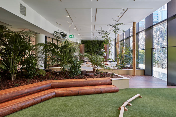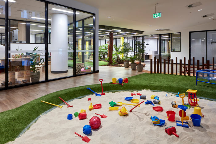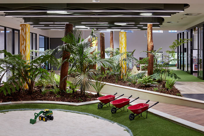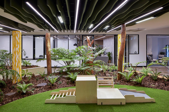 【早教中心裝修廳設(shè)計】心綠植:現(xiàn)在的小朋友已經(jīng)鮮少能夠見到泥土地了,設(shè)計師希望通過綠植室內(nèi)的栽植,讓孩子回歸自然、回歸先天,讓孩子在這樣的空間中感受到自然的魅力。