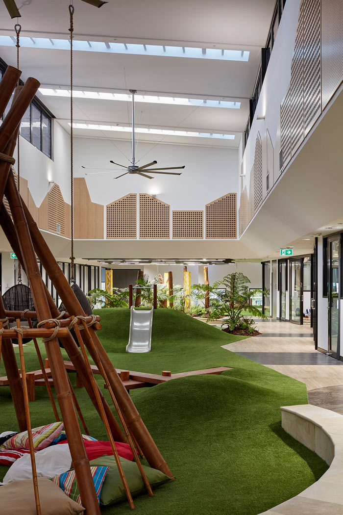 【早教中心裝修廳設(shè)計】游樂區(qū):一塊綠色的草地讓整個空間綠意盎然,孩子在這里嬉戲、玩耍、交朋友、學習,這里宛然成為一個大的游樂場,在玩耍中認識新的朋友,在玩耍中初步建立對于自認的概念。