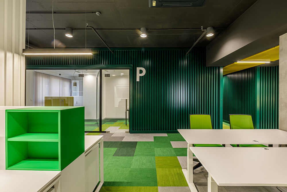 除黑白界限以外,本案例中的另一特色就是空間暢通。整體330平的空間,除了會(huì)議室以外全部暢通,那么個(gè)空間是用什么分割的呢?