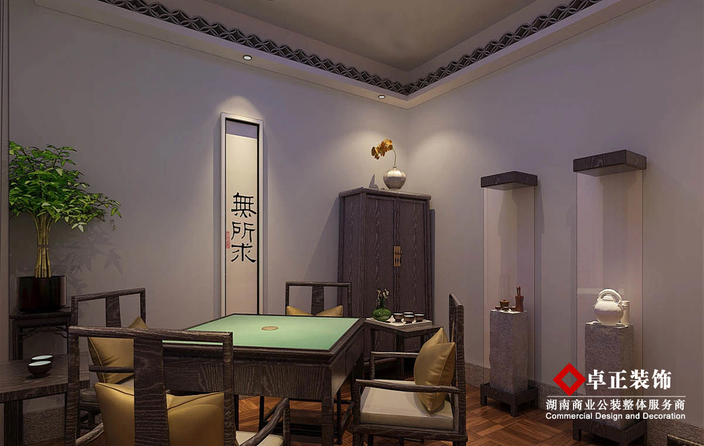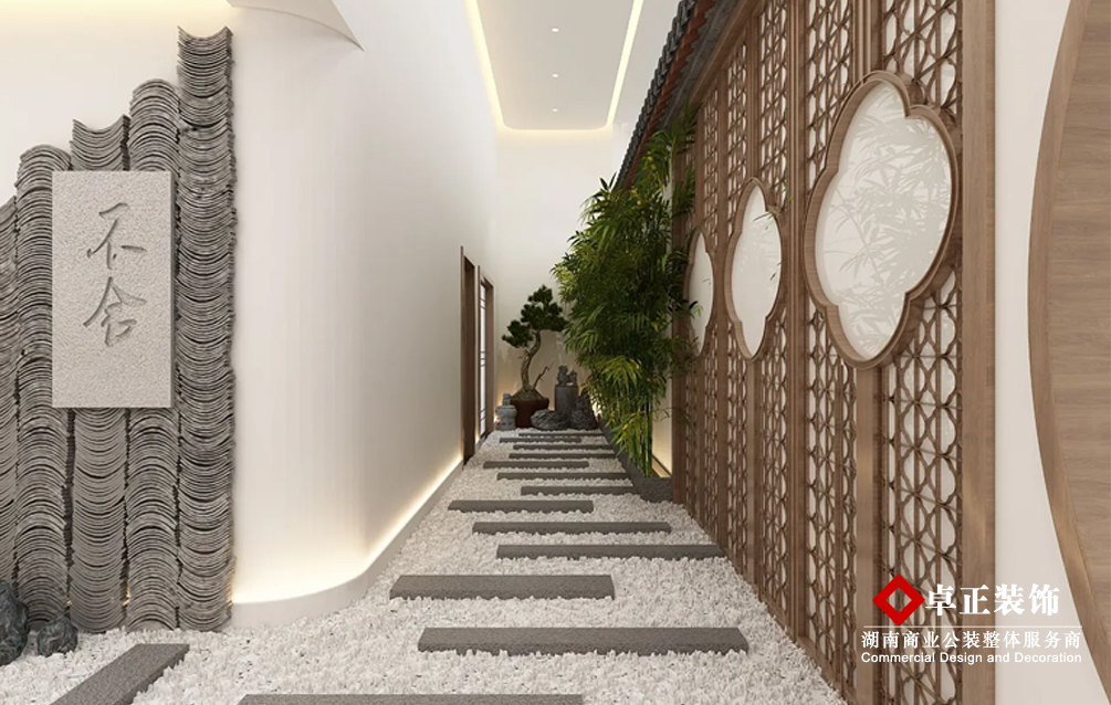 從空間上來說,中式茶樓的基本環(huán)境由接待區(qū)、收銀區(qū)、工作區(qū)、休閑區(qū)、衛(wèi)生間等幾個部分組成,常常采用家具、綠化小品和形象塑造等對中式空間進行靈活隔斷。中式茶樓可以引入古典園林設計中的亭、廊、榭、水景等元素,突出中式的文化氣息,讓傳統(tǒng)中國元素符號在整個空間中得以穿插。